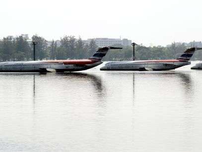 Enchentes deixaram aviões ilhados na pista do aeroporto Don Mueang, em Bangcoc. O aeroporto está sendo temporariamente utilizado como refúgio para desabrigados pelas chuvas na capital da Tailândia.